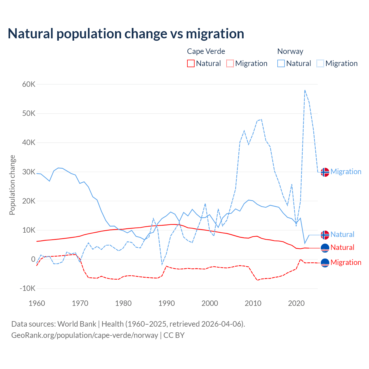 Over the last 10 years, 56.4% of the population change in Cape Verde is from natural causes (a gain of 50,193 people) and 43.6% is from migration (a loss of 38,879 people). In Norway 31.3% is from natural causes (a gain of 138,699 people) and 68.7% is from migration (a gain of 303,945 people).