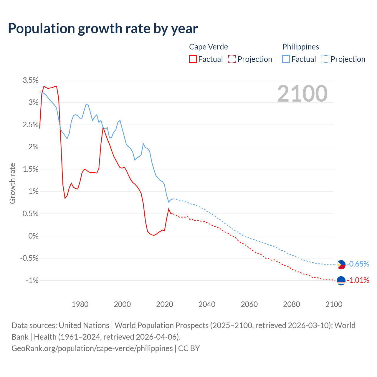 - For the last 10 years, Cape Verde has had an average growth rate of +0.22% per year vs +1.16% in the Philippines.