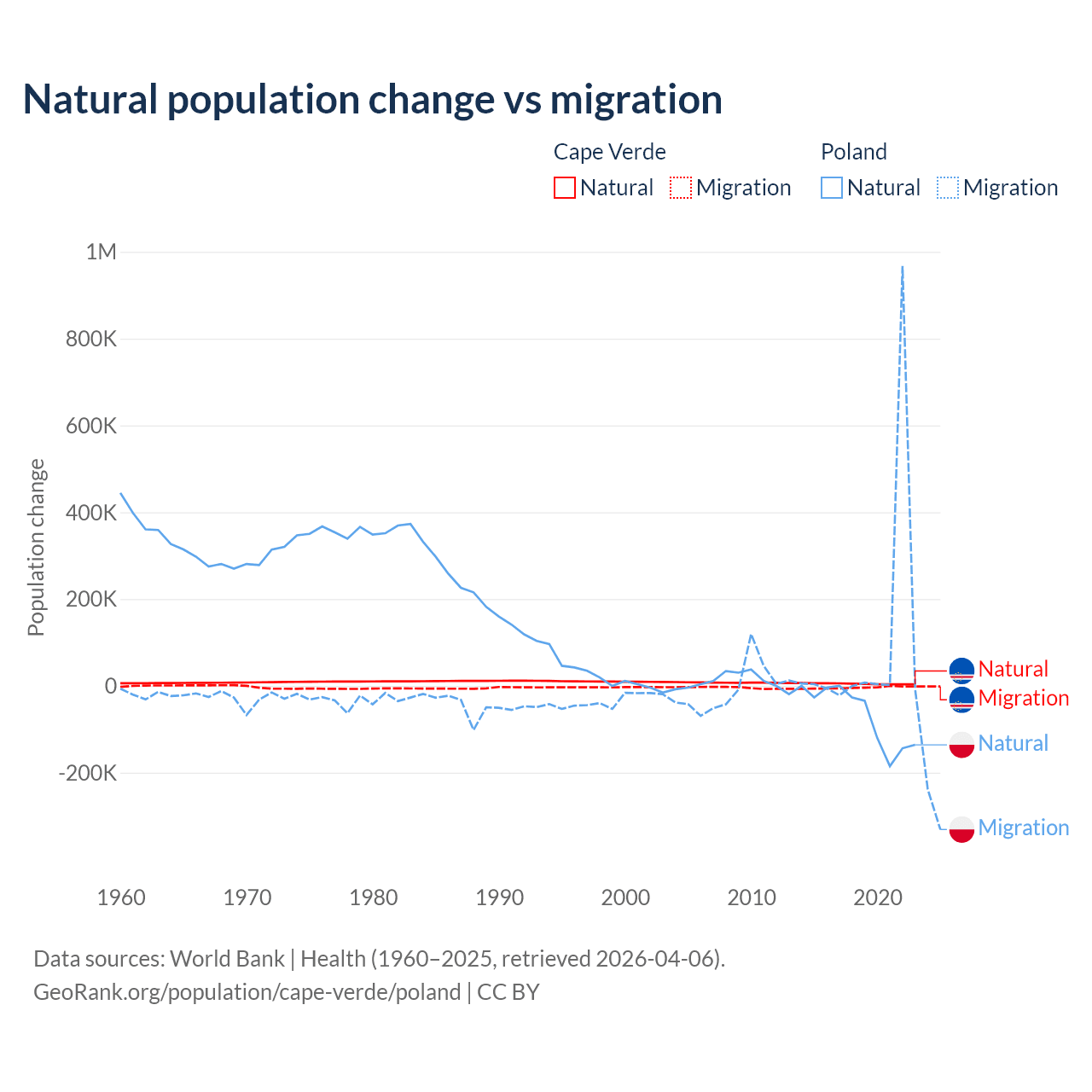 Over the last 10 years, 56.4% of the population change in Cape Verde is from natural causes (a gain of 50,193 people) and 43.6% is from migration (a loss of 38,879 people). In Poland 41.4% is from natural causes (a loss of 675,443 people) and 58.6% is from migration (a gain of 955,766 people).
