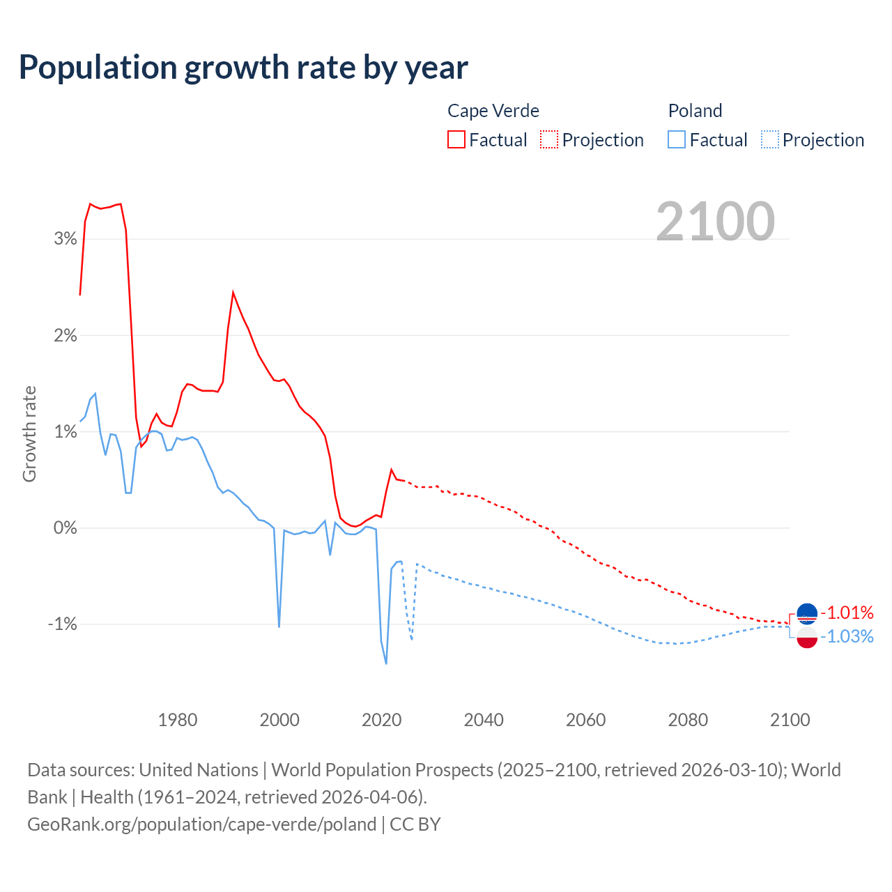 - For the last 10 years, Cape Verde has had an average growth rate of +0.22% per year vs -0.36% in Poland.
