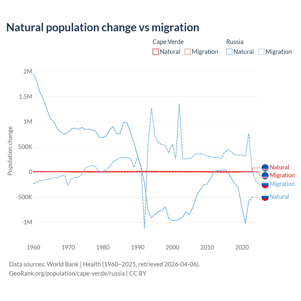 Over the last 10 years, 56.4% of the population change in Cape Verde is from natural causes (a gain of 50,193 people) and 43.6% is from migration (a loss of 38,879 people). In Russia 48.6% is from natural causes (a loss of 3,416,377 people) and 51.4% is from migration (a gain of 3,611,826 people).