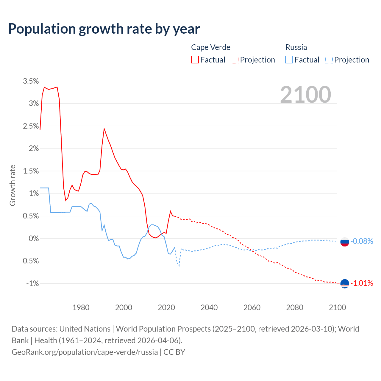 - For the last 10 years, Cape Verde has had an average growth rate of +0.22% per year vs -0.02% in Russia.