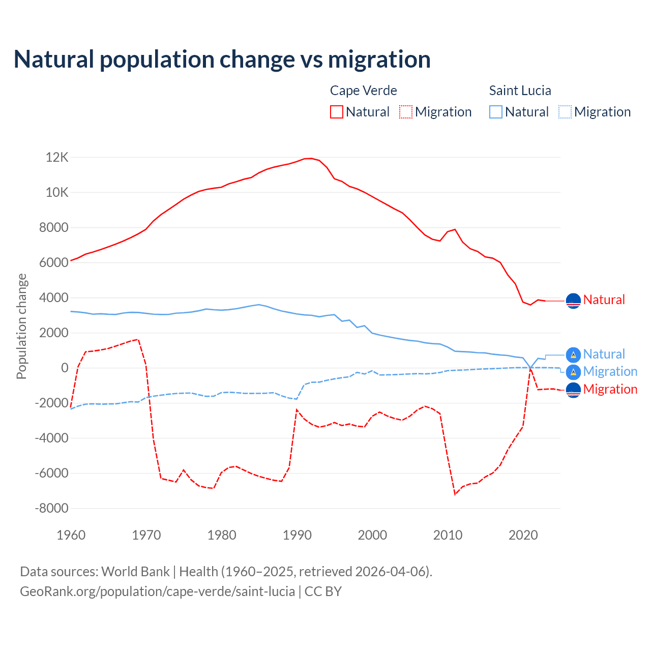 Over the last 10 years, 56.4% of the population change in Cape Verde is from natural causes (a gain of 50,193 people) and 43.6% is from migration (a loss of 38,879 people). In Saint Lucia 95.7% is from natural causes (a gain of 6,039 people) and 4.31% is from migration (a loss of 272 people).