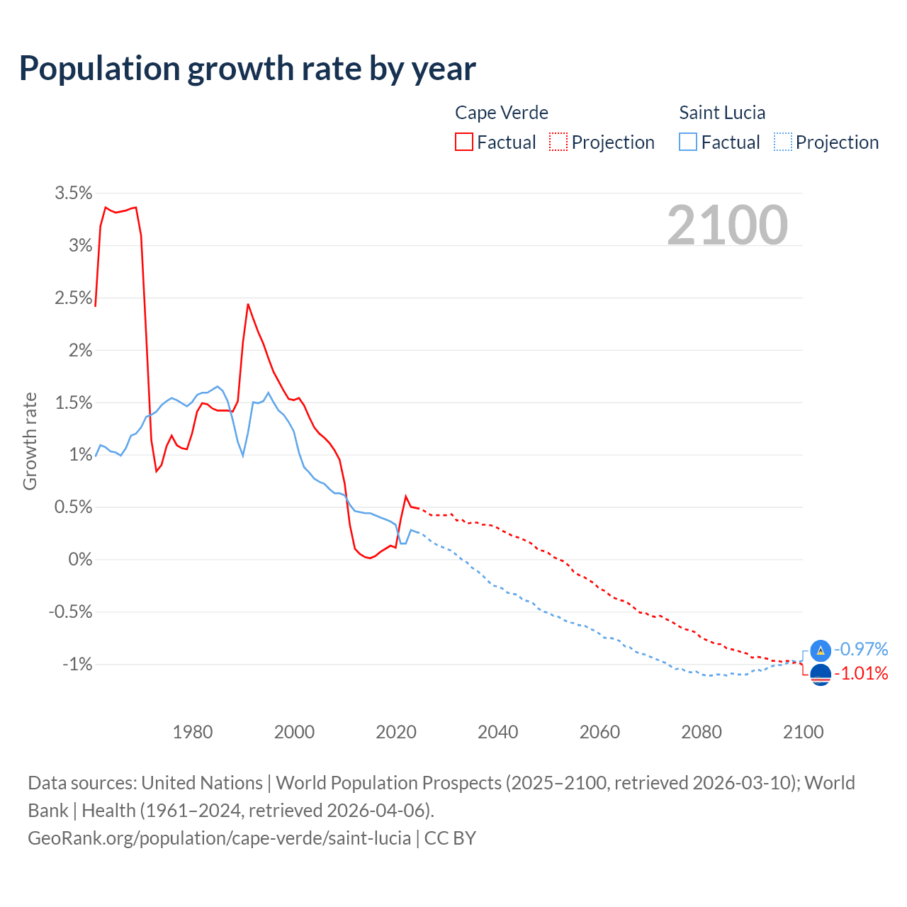 - For the last 10 years, Cape Verde has had an average growth rate of +0.22% per year vs +0.33% in Saint Lucia.