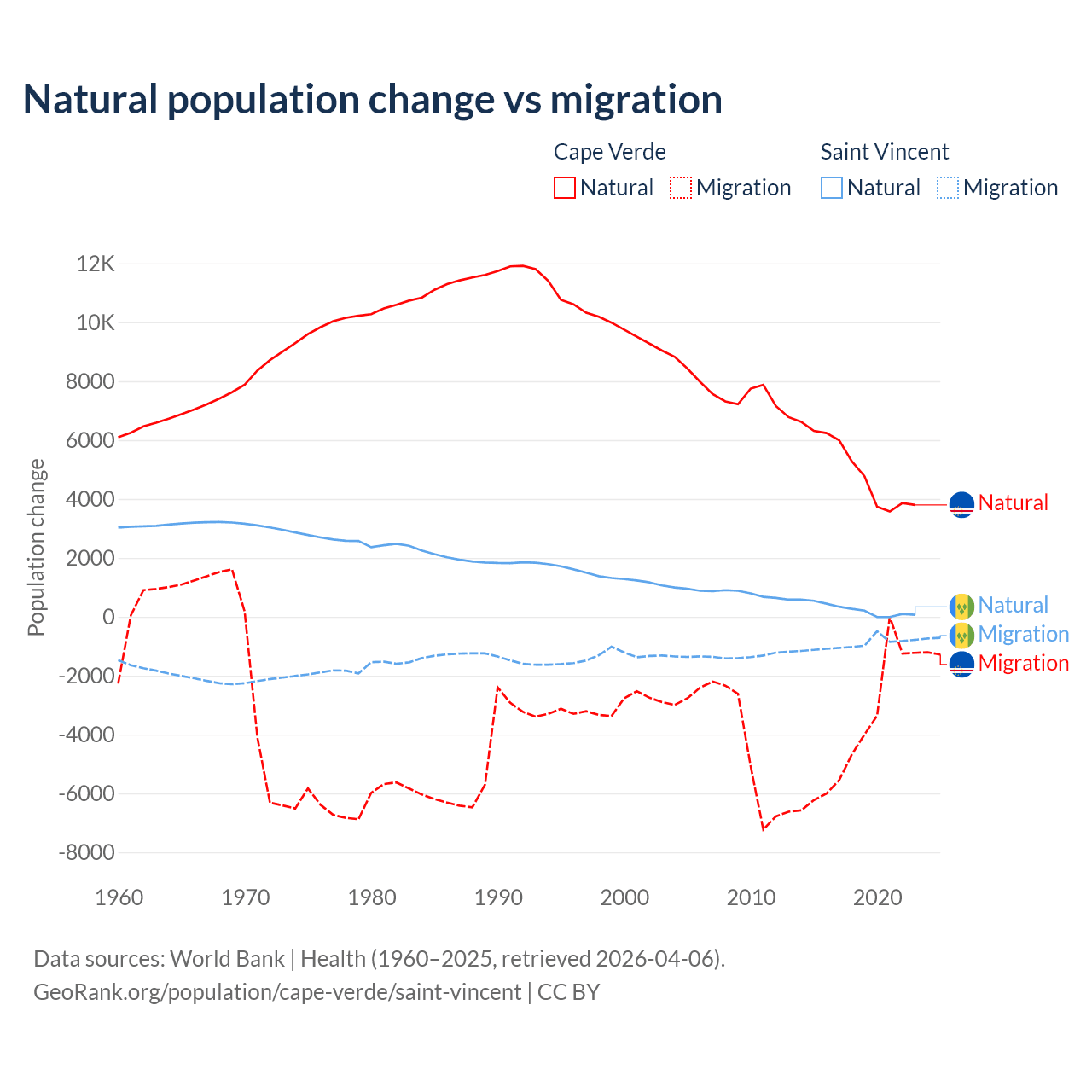 Over the last 10 years, 56.4% of the population change in Cape Verde is from natural causes (a gain of 50,193 people) and 43.6% is from migration (a loss of 38,879 people). In Saint Vincent 21.2% is from natural causes (a gain of 2,525 people) and 78.8% is from migration (a loss of 9,393 people).