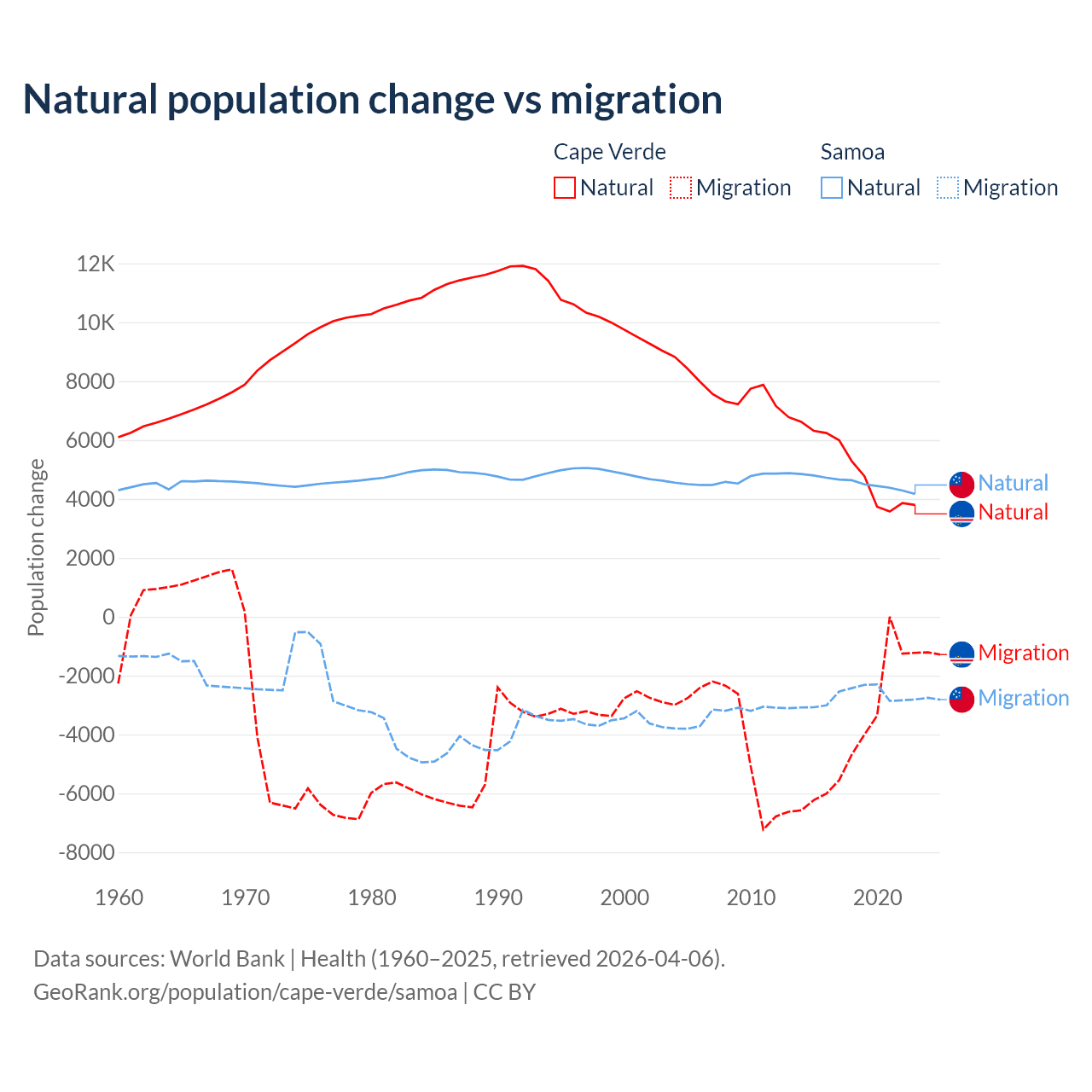 Over the last 10 years, 56.4% of the population change in Cape Verde is from natural causes (a gain of 50,193 people) and 43.6% is from migration (a loss of 38,879 people). In Samoa 62.5% is from natural causes (a gain of 45,436 people) and 37.5% is from migration (a loss of 27,246 people).