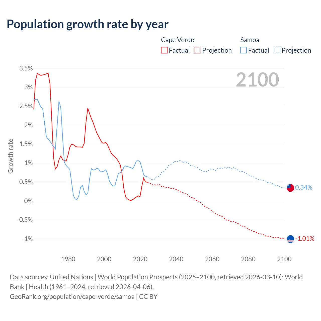 - For the last 10 years, Cape Verde has had an average growth rate of +0.22% per year vs +0.87% in Samoa.