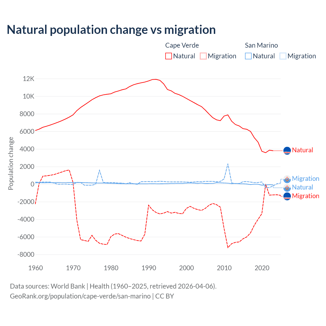Over the last 10 years, 56.4% of the population change in Cape Verde is from natural causes (a gain of 50,193 people) and 43.6% is from migration (a loss of 38,879 people). In San Marino 40.9% is from natural causes (a loss of 358 people) and 59.1% is from migration (a gain of 517 people).