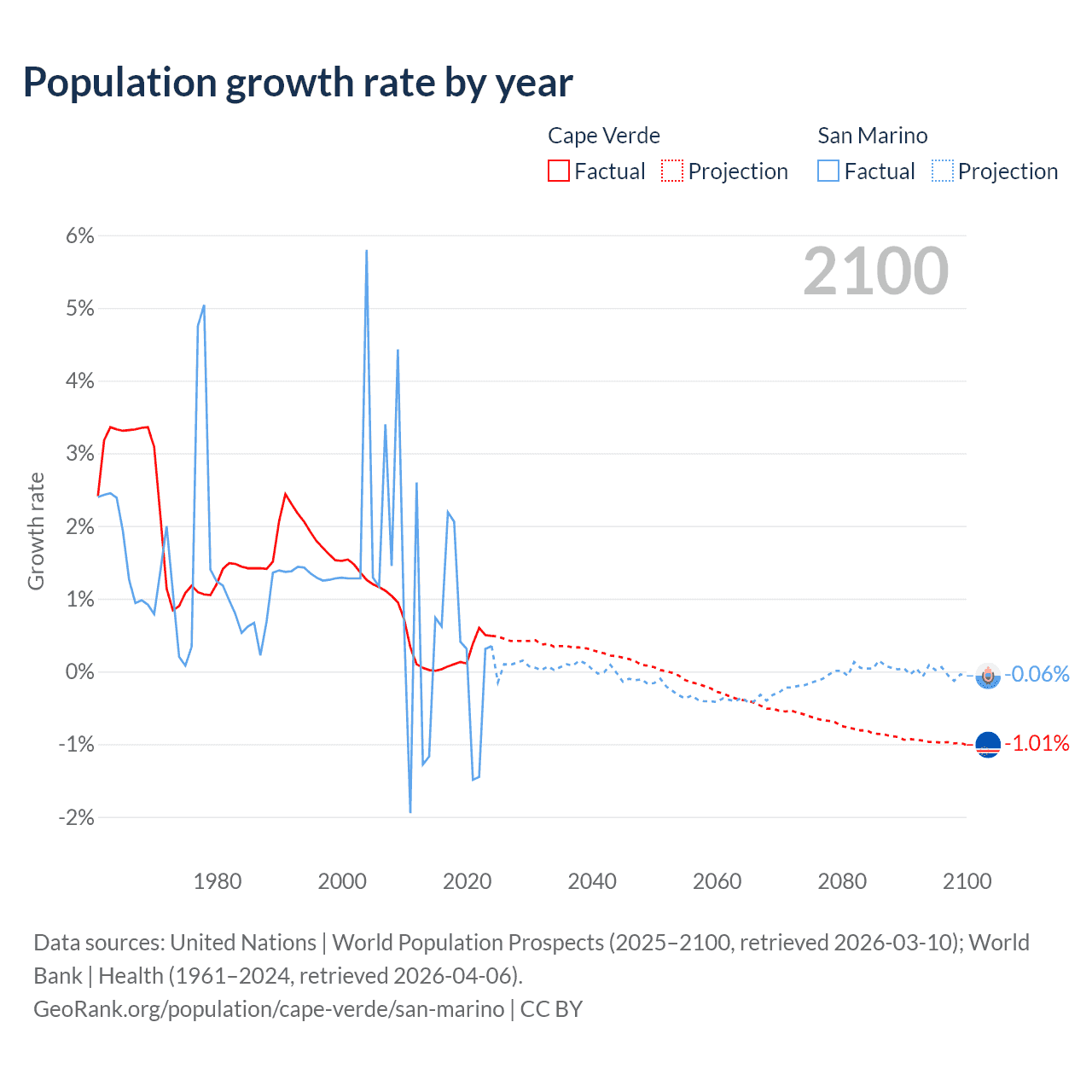 - For the last 10 years, Cape Verde has had an average growth rate of +0.22% per year vs +0.26% in San Marino.