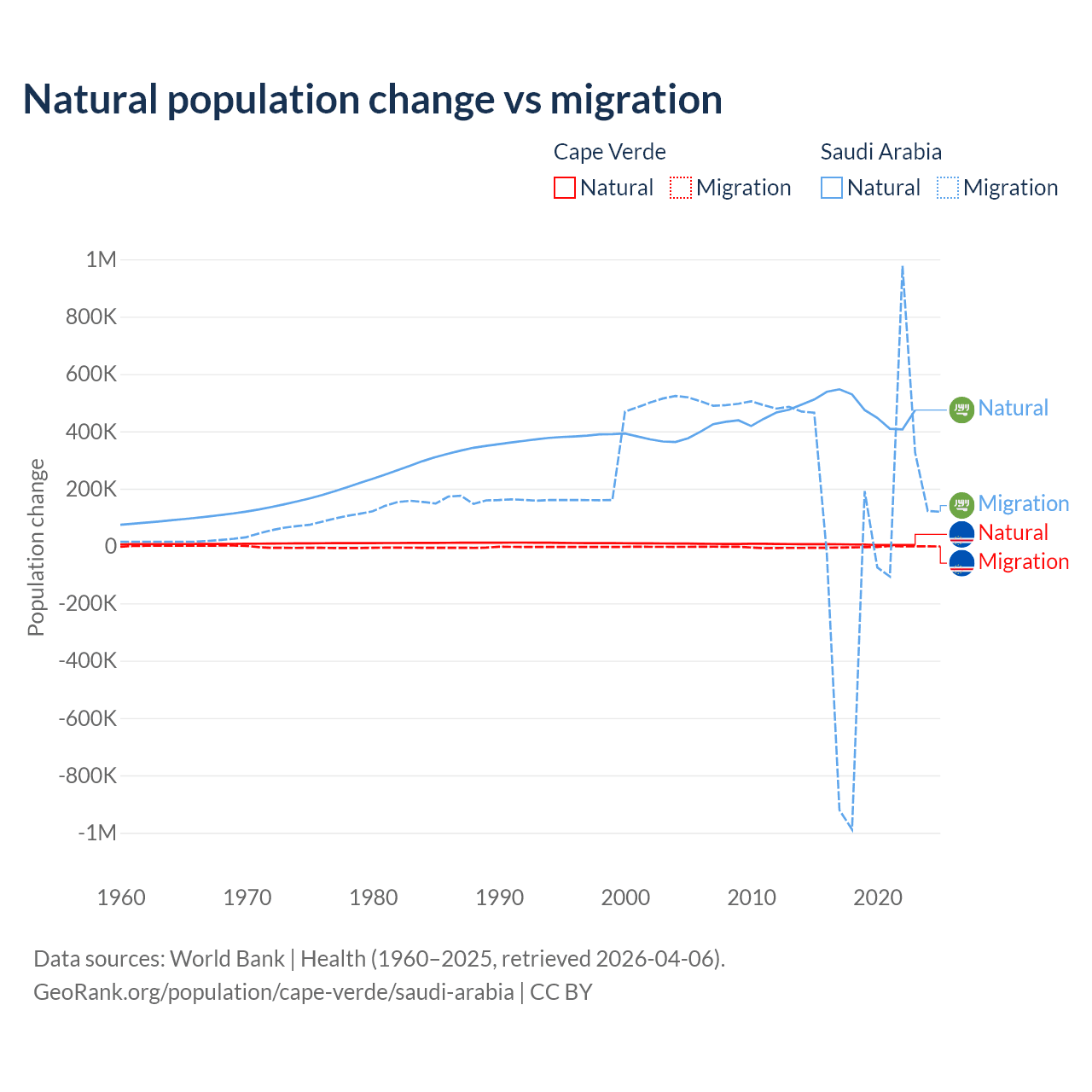 Over the last 10 years, 56.4% of the population change in Cape Verde is from natural causes (a gain of 50,193 people) and 43.6% is from migration (a loss of 38,879 people). In Saudi Arabia 93.9% is from natural causes (a gain of 4,829,562 people) and 6.05% is from migration (a gain of 311,209 people).