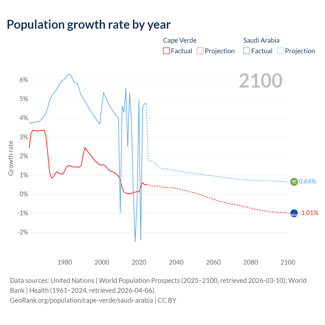 - For the last 10 years, Cape Verde has had an average growth rate of +0.22% per year vs +2.3% in Saudi Arabia.