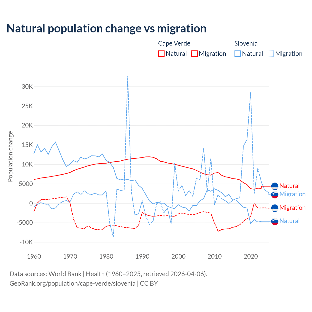 Over the last 10 years, 56.4% of the population change in Cape Verde is from natural causes (a gain of 50,193 people) and 43.6% is from migration (a loss of 38,879 people). In Slovenia 18.1% is from natural causes (a loss of 17,573 people) and 81.9% is from migration (a gain of 79,532 people).