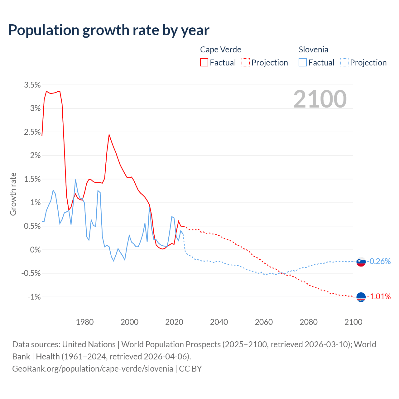- For the last 10 years, Cape Verde has had an average growth rate of +0.22% per year vs +0.29% in Slovenia.