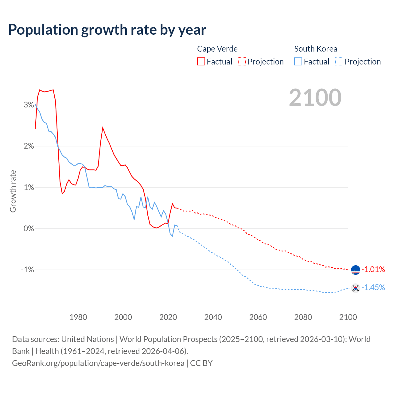 - For the last 10 years, Cape Verde has had an average growth rate of +0.22% per year vs +0.24% in South Korea.