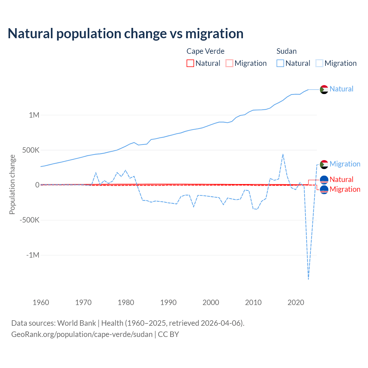 Over the last 10 years, 56.4% of the population change in Cape Verde is from natural causes (a gain of 50,193 people) and 43.6% is from migration (a loss of 38,879 people). In Sudan 95.1% is from natural causes (a gain of 12,459,977 people) and 4.88% is from migration (a loss of 639,596 people).