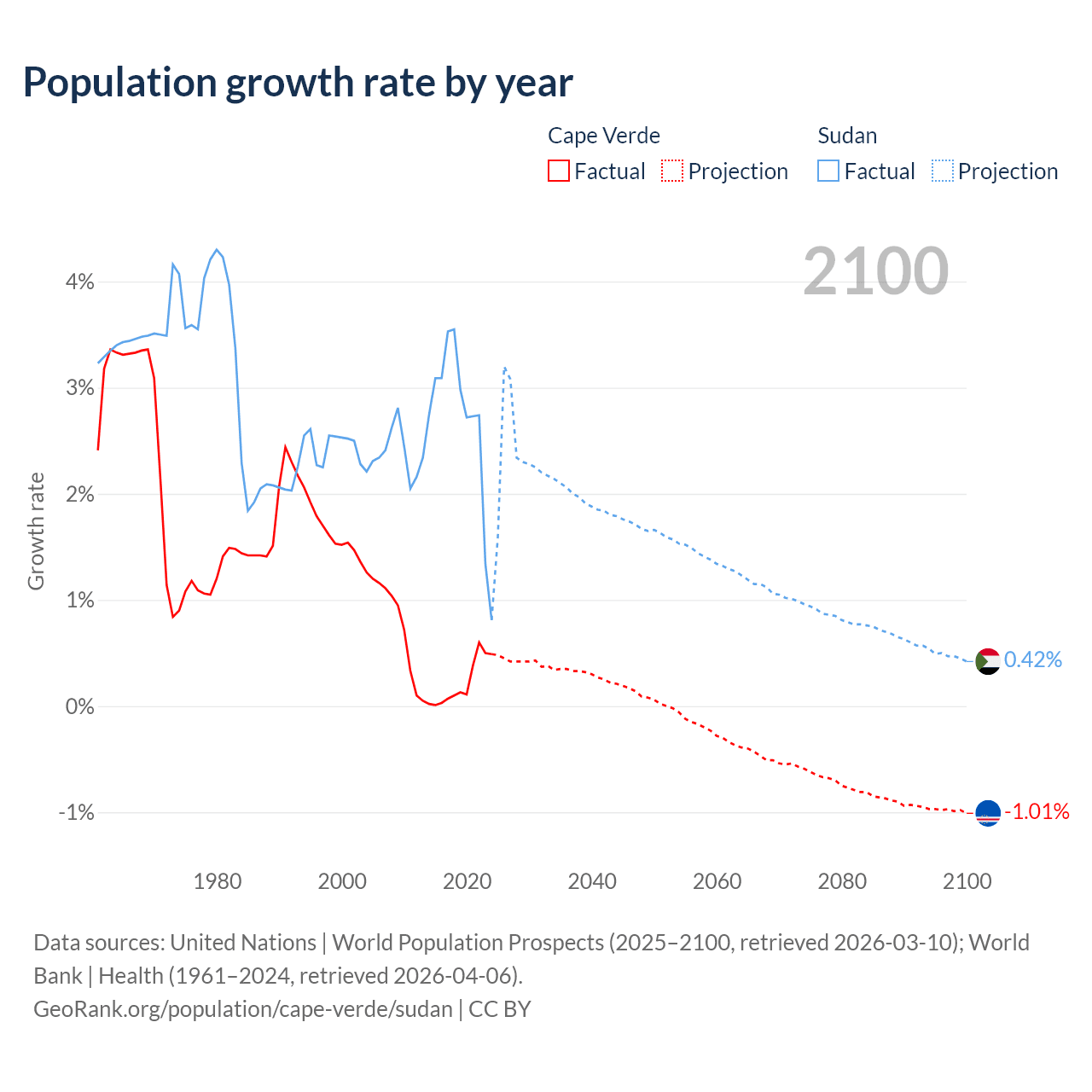 - For the last 10 years, Cape Verde has had an average growth rate of +0.22% per year vs +2.67% in Sudan.
