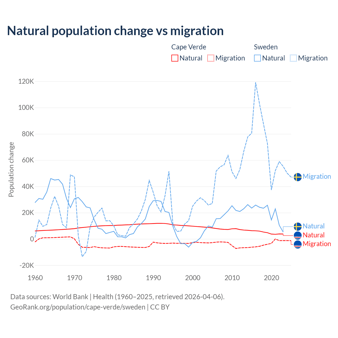 Over the last 10 years, 56.4% of the population change in Cape Verde is from natural causes (a gain of 50,193 people) and 43.6% is from migration (a loss of 38,879 people). In Sweden 21.4% is from natural causes (a gain of 201,900 people) and 78.6% is from migration (a gain of 743,642 people).