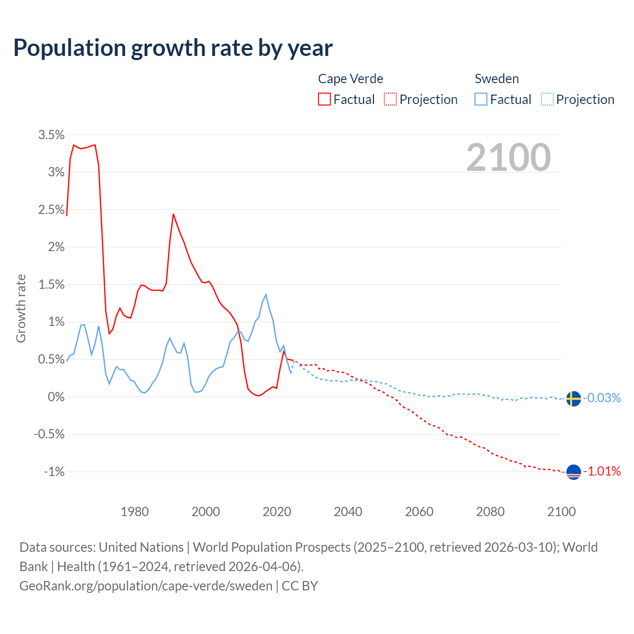 - For the last 10 years, Cape Verde has had an average growth rate of +0.22% per year vs +0.88% in Sweden.