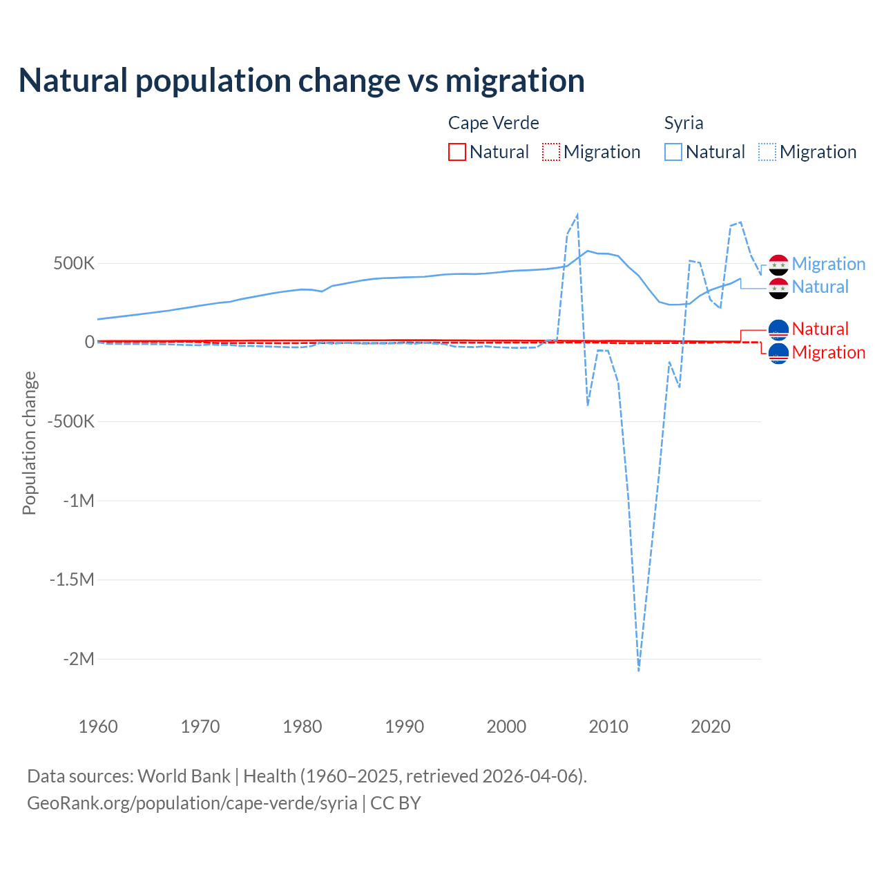 Over the last 10 years, 56.4% of the population change in Cape Verde is from natural causes (a gain of 50,193 people) and 43.6% is from migration (a loss of 38,879 people). In Syria 91.3% is from natural causes (a gain of 3,047,621 people) and 8.72% is from migration (a gain of 291,069 people).