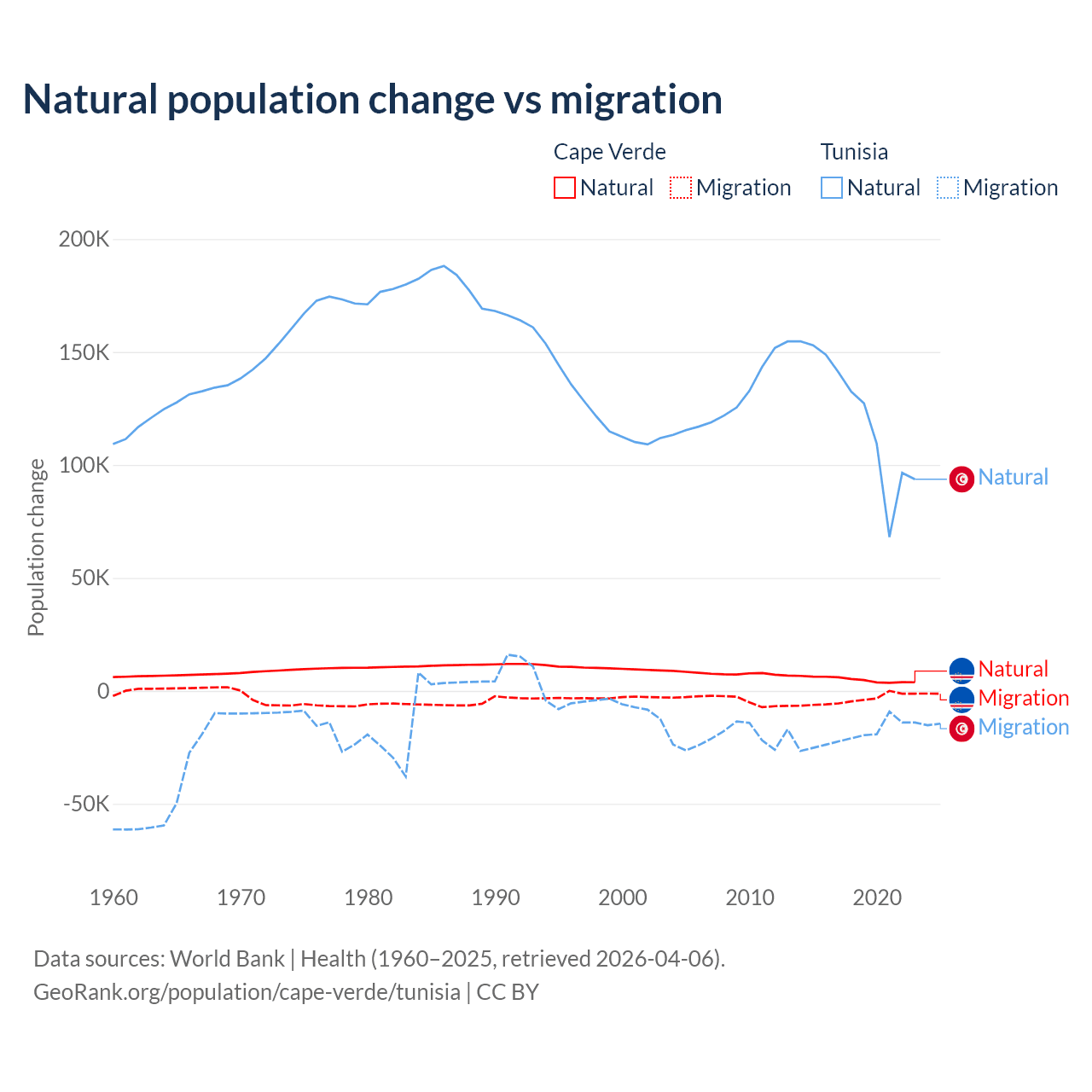 Over the last 10 years, 56.4% of the population change in Cape Verde is from natural causes (a gain of 50,193 people) and 43.6% is from migration (a loss of 38,879 people). In Tunisia 86.3% is from natural causes (a gain of 1,225,079 people) and 13.7% is from migration (a loss of 195,011 people).
