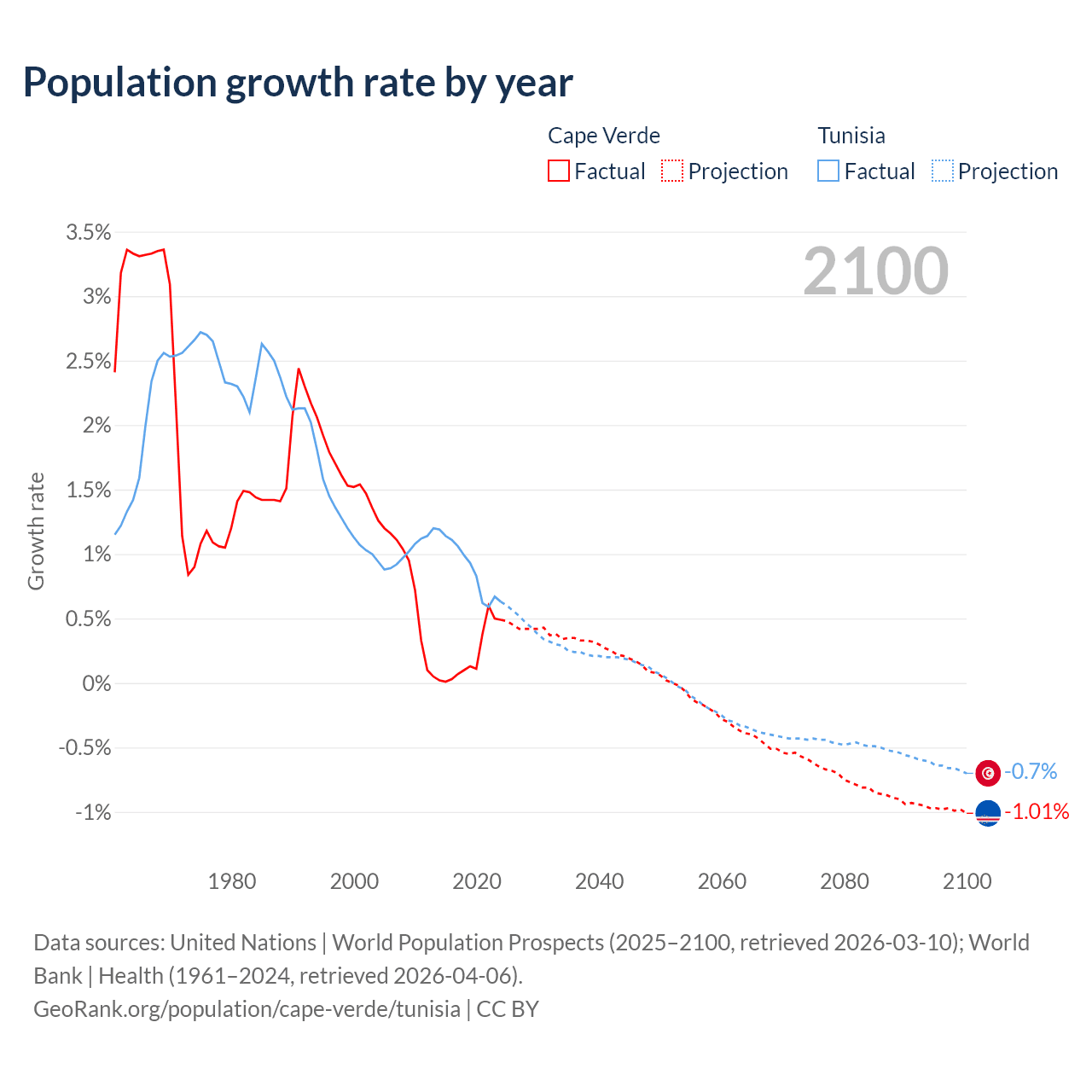 - For the last 10 years, Cape Verde has had an average growth rate of +0.22% per year vs +0.89% in Tunisia.