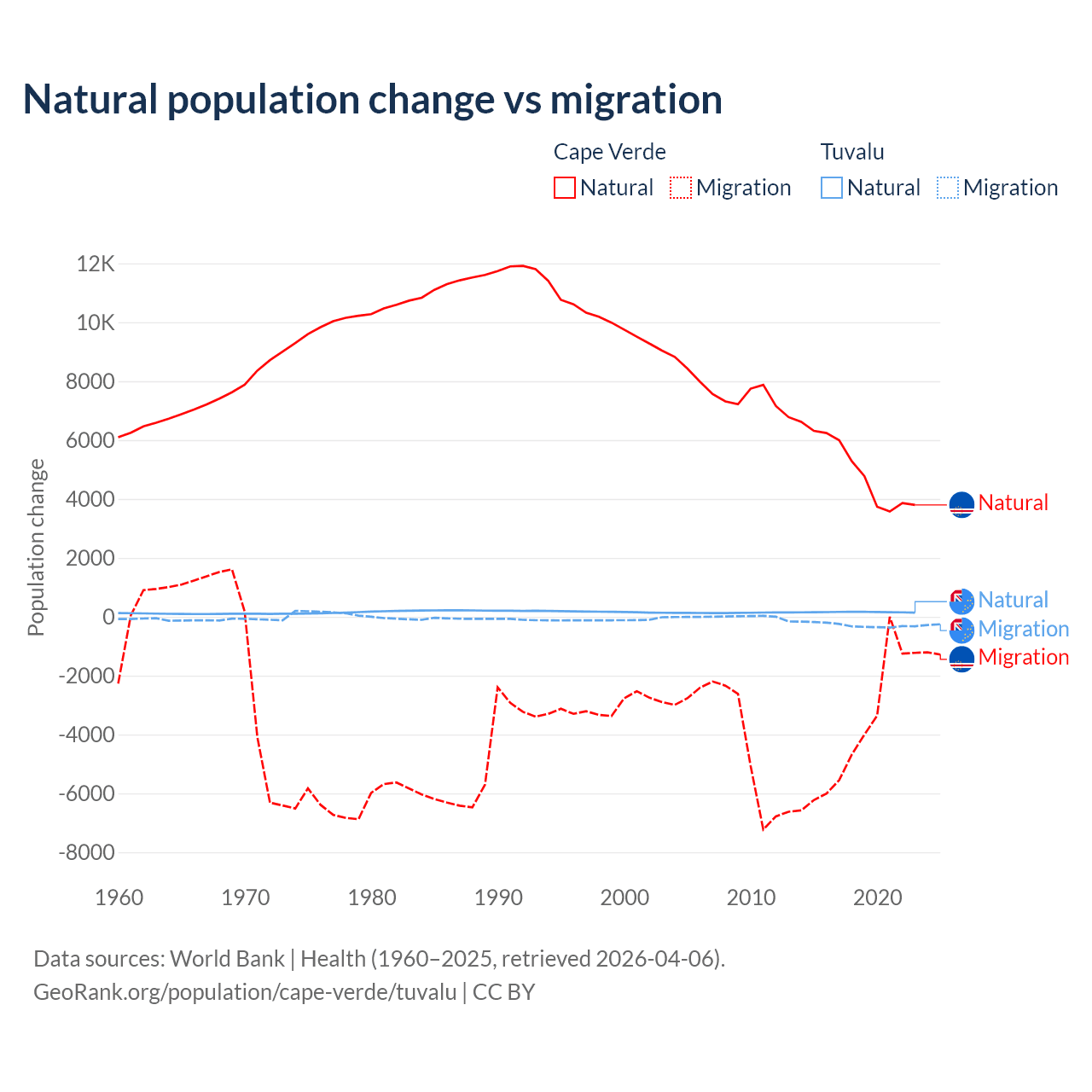Over the last 10 years, 56.4% of the population change in Cape Verde is from natural causes (a gain of 50,193 people) and 43.6% is from migration (a loss of 38,879 people). In Tuvalu 35.5% is from natural causes (a gain of 1,556 people) and 64.5% is from migration (a loss of 2,827 people).