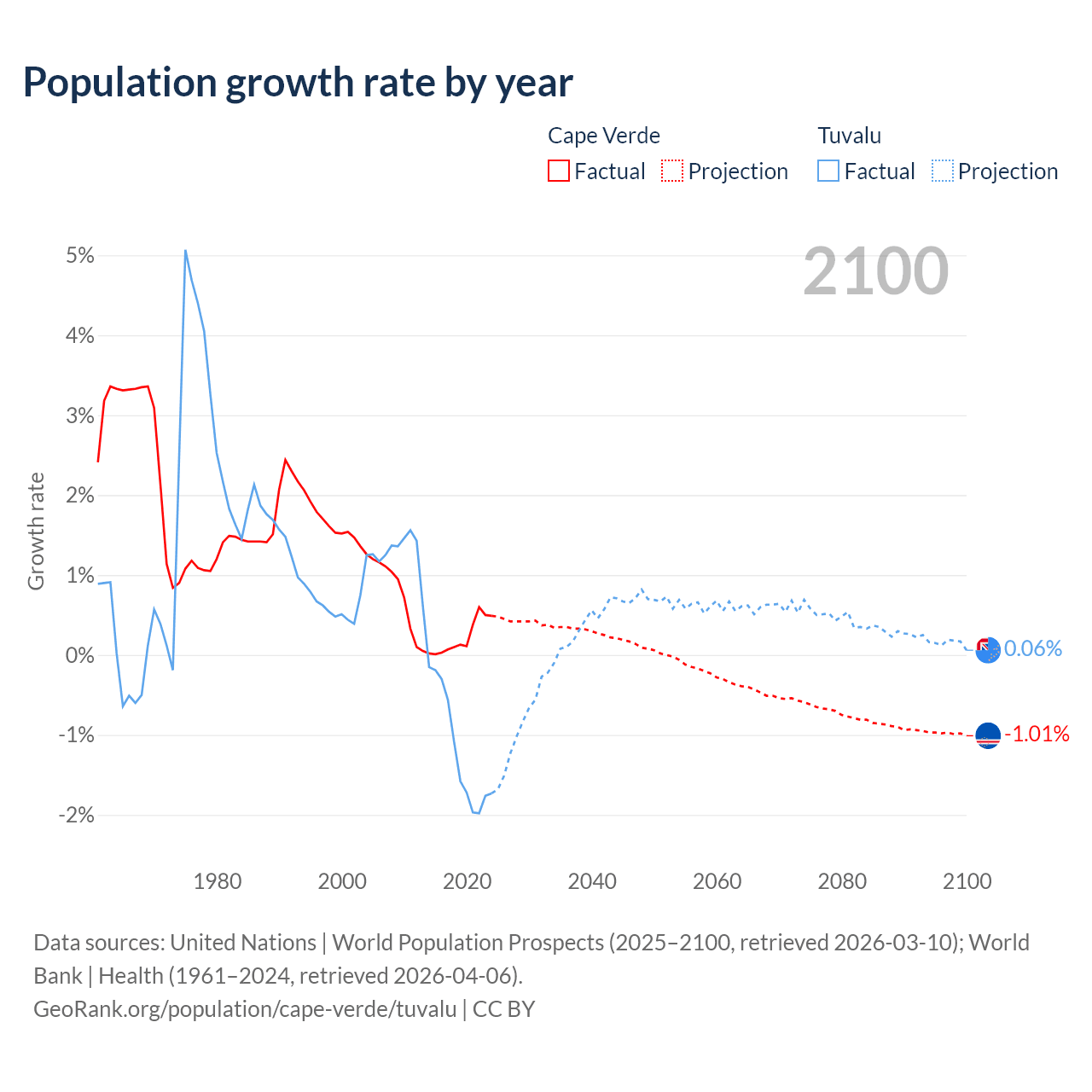 - For the last 10 years, Cape Verde has had an average growth rate of +0.22% per year vs -1.19% in Tuvalu.