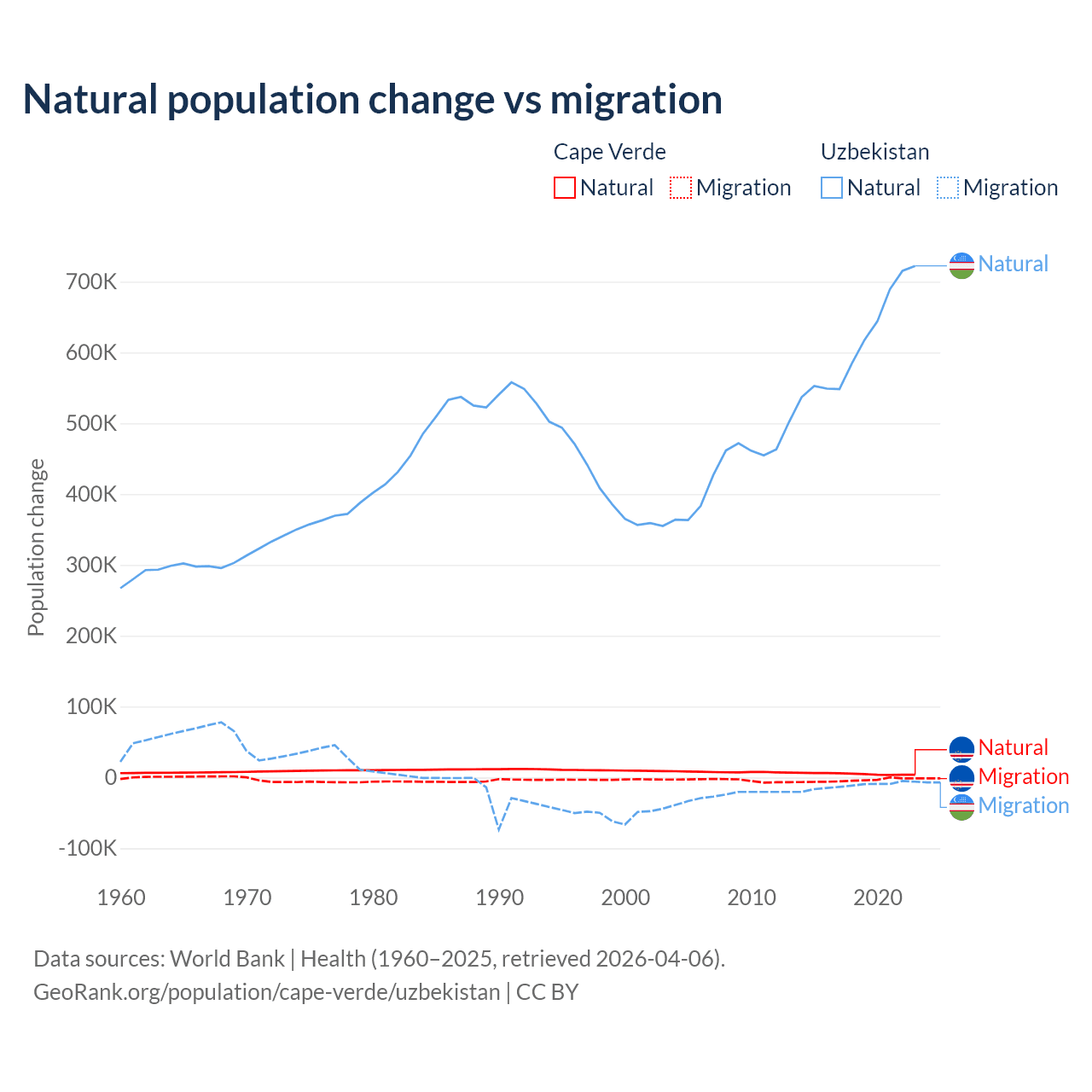 Over the last 10 years, 56.4% of the population change in Cape Verde is from natural causes (a gain of 50,193 people) and 43.6% is from migration (a loss of 38,879 people). In Uzbekistan 98.2% is from natural causes (a gain of 6,161,117 people) and 1.84% is from migration (a loss of 115,398 people).