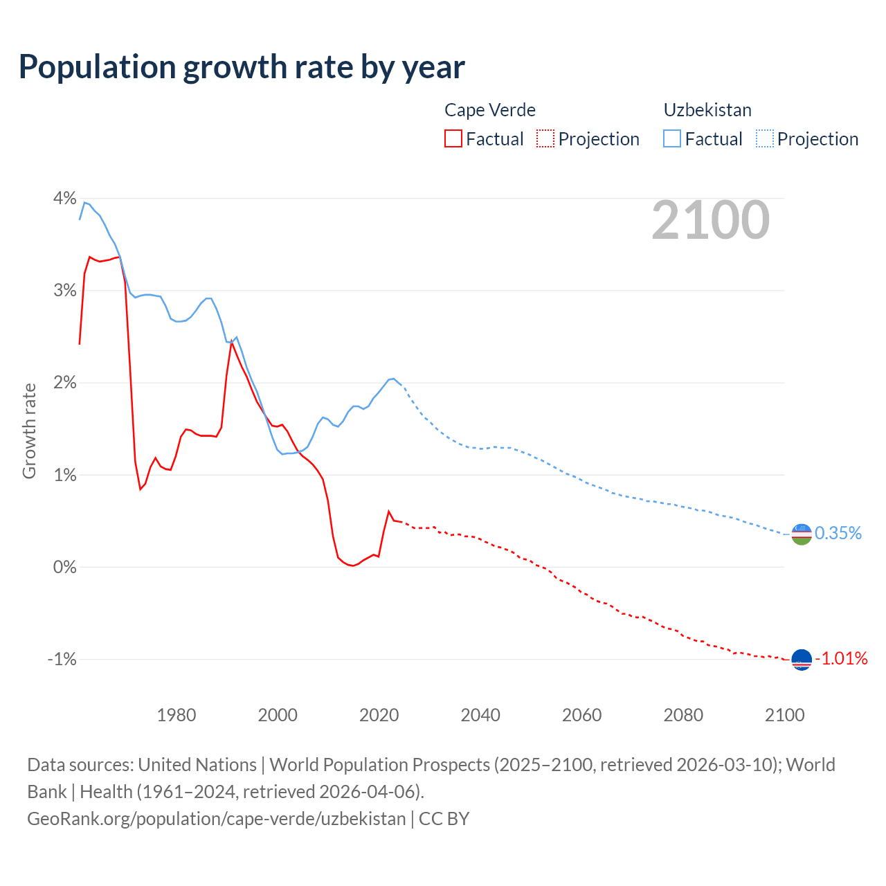 - For the last 10 years, Cape Verde has had an average growth rate of +0.22% per year vs +1.85% in Uzbekistan.
