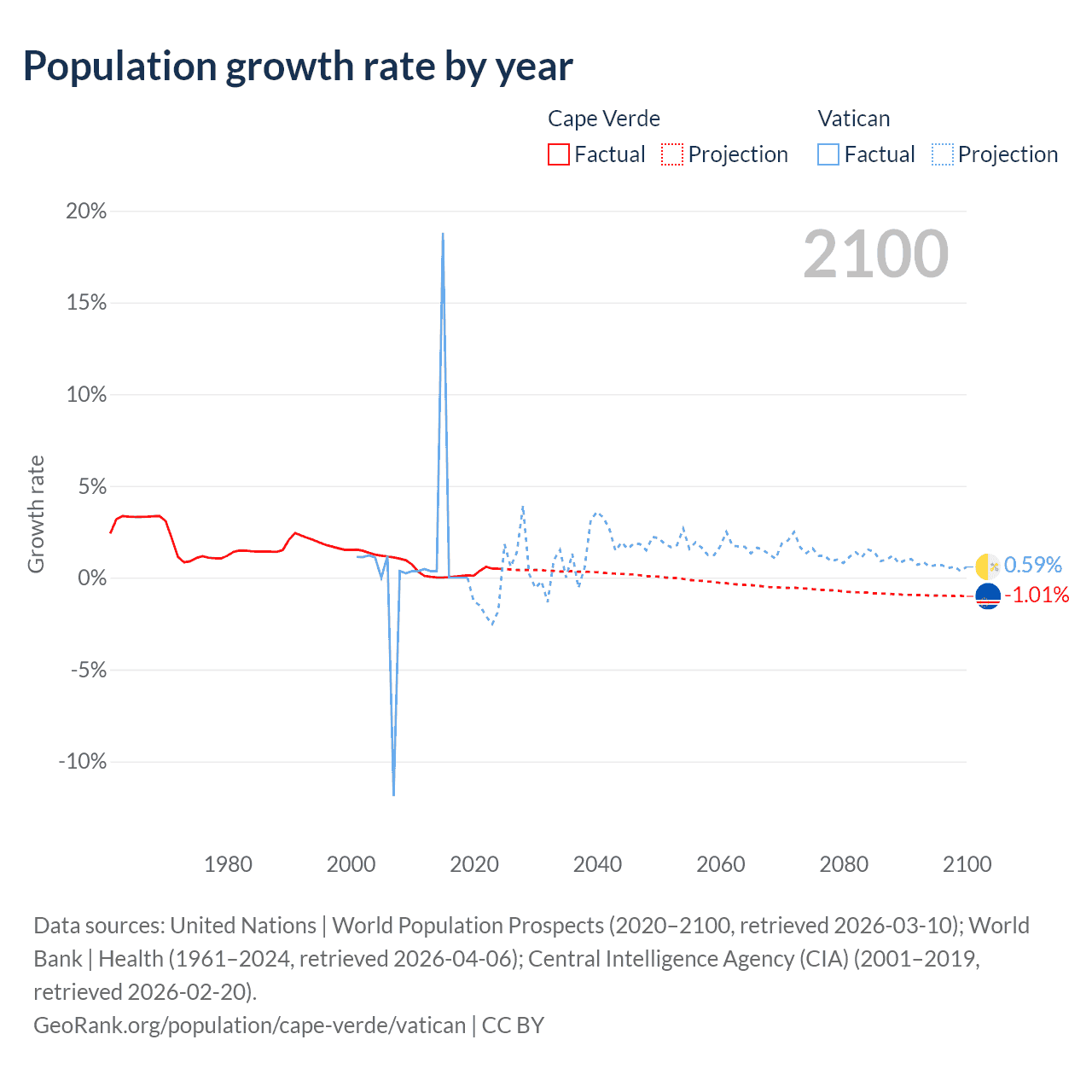 - For the last 10 years, Cape Verde has had an average growth rate of +0.22% per year vs +1.9% in the Vatican.