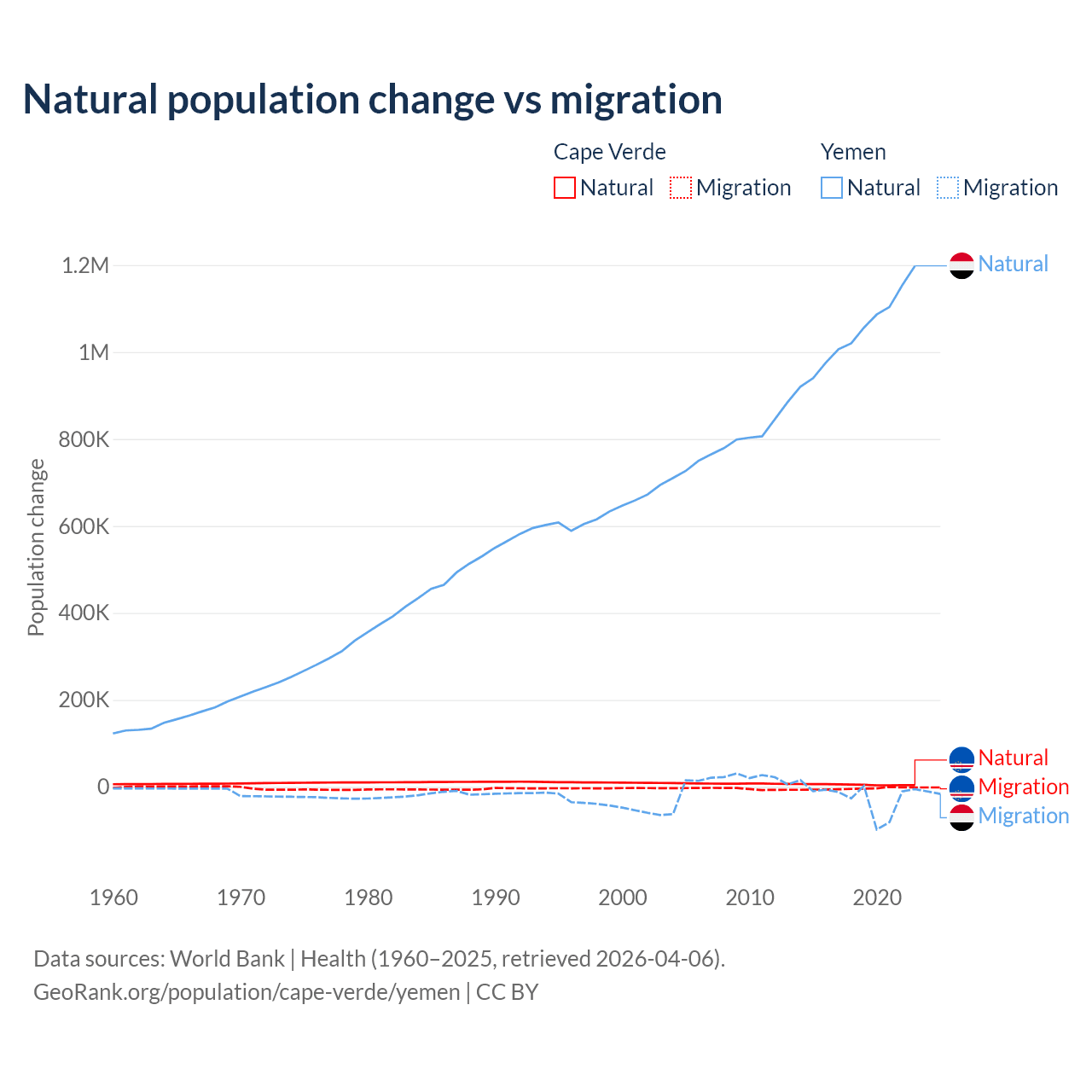 Over the last 10 years, 56.4% of the population change in Cape Verde is from natural causes (a gain of 50,193 people) and 43.6% is from migration (a loss of 38,879 people). In Yemen 97.8% is from natural causes (a gain of 10,460,813 people) and 2.17% is from migration (a loss of 231,814 people).