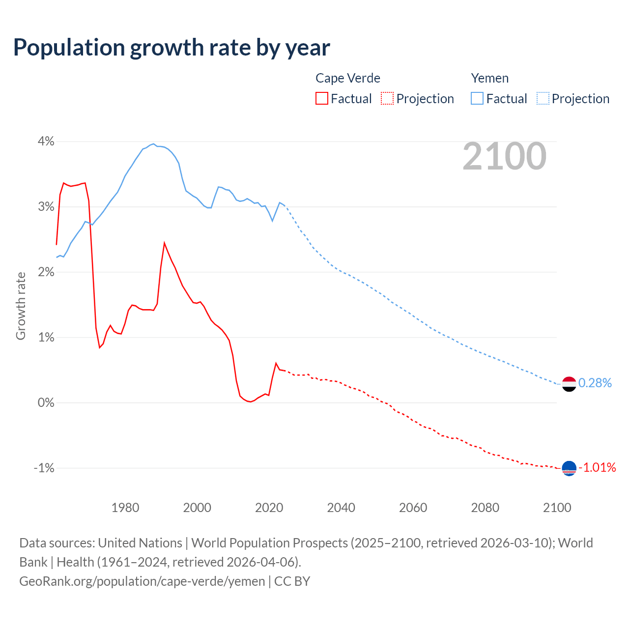 - For the last 10 years, Cape Verde has had an average growth rate of +0.22% per year vs +3% in Yemen.