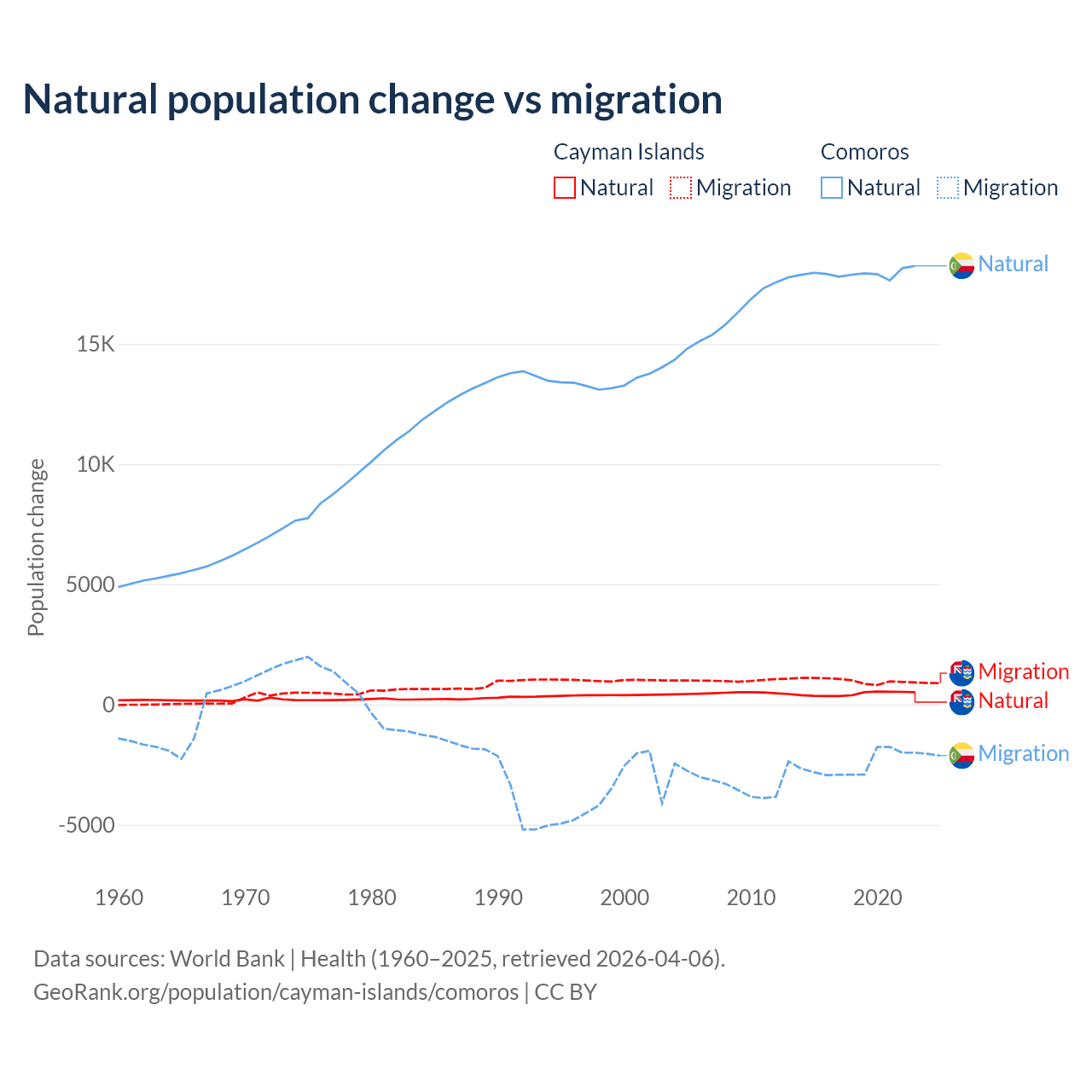 Over the last 10 years, 31.1% of the population change in the Cayman Islands is from natural causes (a gain of 4,468 people) and 68.9% is from migration (a gain of 9,879 people). In Comoros 87.9% is from natural causes (a gain of 179,319 people) and 12.1% is from migration (a loss of 24,709 people).