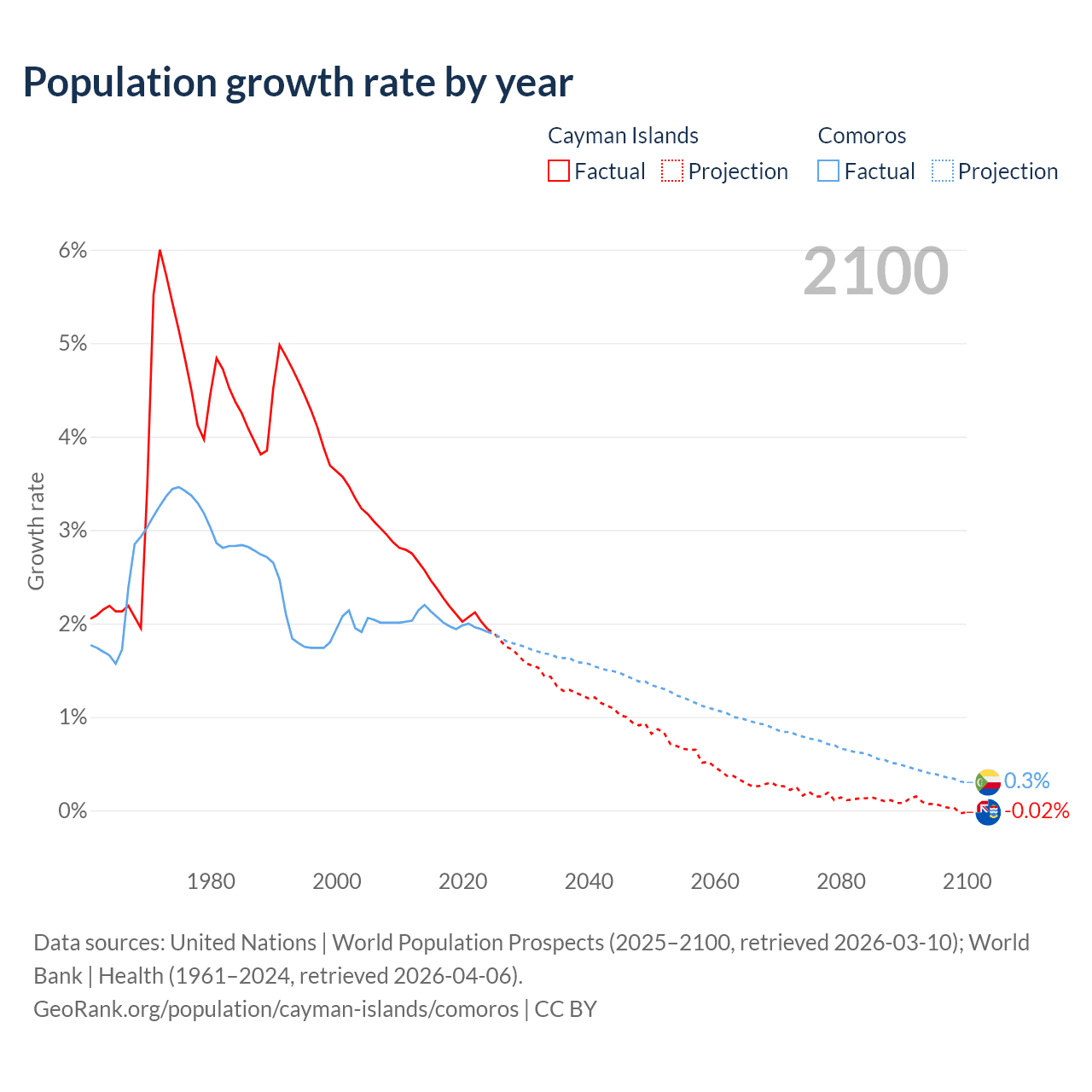 - For the last 10 years, the Cayman Islands has had an average growth rate of +2.19% per year vs +2.01% in Comoros.