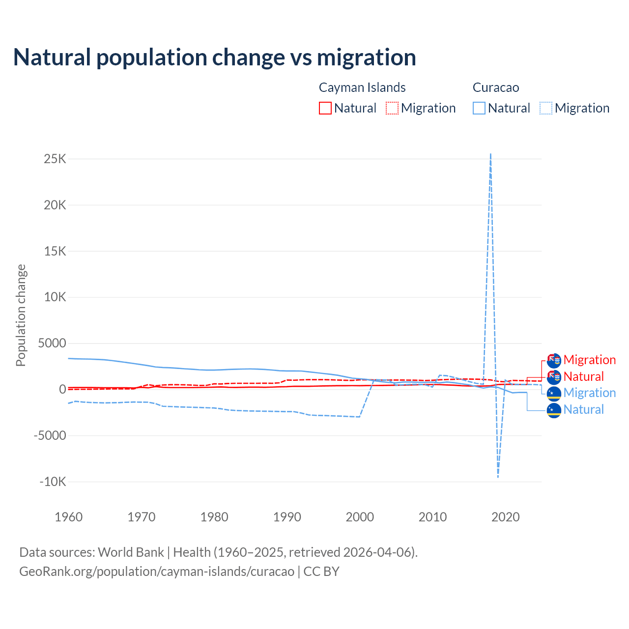 Over the last 10 years, 31.1% of the population change in the Cayman Islands is from natural causes (a gain of 4,468 people) and 68.9% is from migration (a gain of 9,879 people). In Curacao 3.72% is from natural causes (a gain of 834 people) and 96.3% is from migration (a gain of 21,615 people).