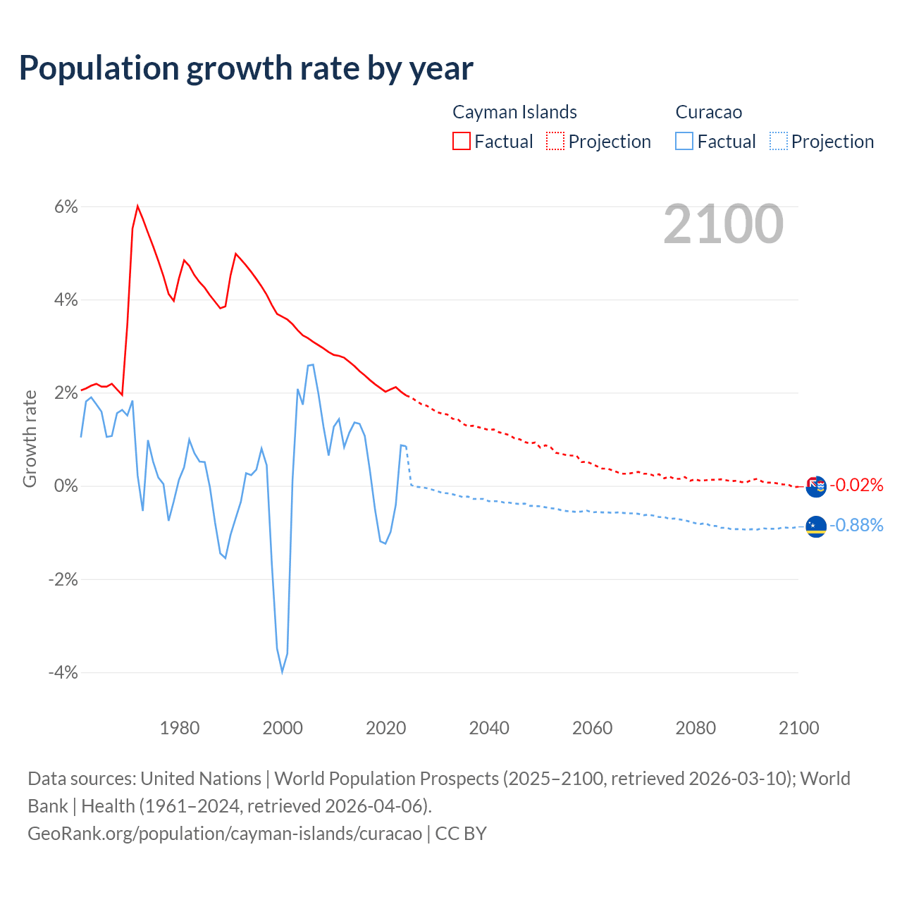 Data sources: World Bank | Health (1960–2024, retrieved 2026-04-06); United Nations | World Population Prospects (1960–2026, retrieved 2026-03-10); U.S. Census Bureau (1960–2025, retrieved 2026-02-08); Central Intelligence Agency (CIA) (2000–2019, retrieved 2026-02-20).