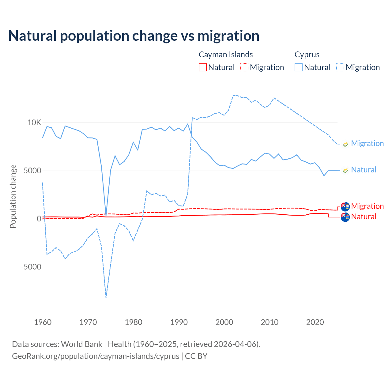 Over the last 10 years, 31.1% of the population change in the Cayman Islands is from natural causes (a gain of 4,468 people) and 68.9% is from migration (a gain of 9,879 people). In Cyprus 36.2% is from natural causes (a gain of 57,464 people) and 63.8% is from migration (a gain of 101,458 people).