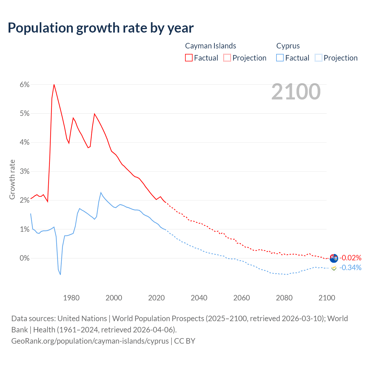 - For the last 10 years, the Cayman Islands has had an average growth rate of +2.19% per year vs +1.26% in Cyprus.