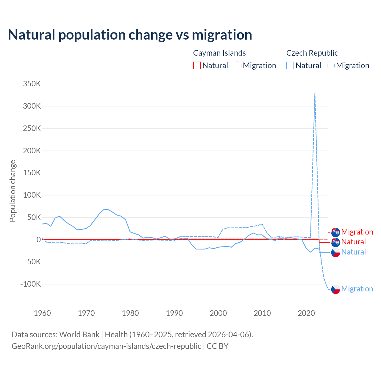 Over the last 10 years, 31.1% of the population change in the Cayman Islands is from natural causes (a gain of 4,468 people) and 68.9% is from migration (a gain of 9,879 people). In the Czech Republic 17.3% is from natural causes (a loss of 74,826 people) and 82.7% is from migration (a gain of 357,502 people).