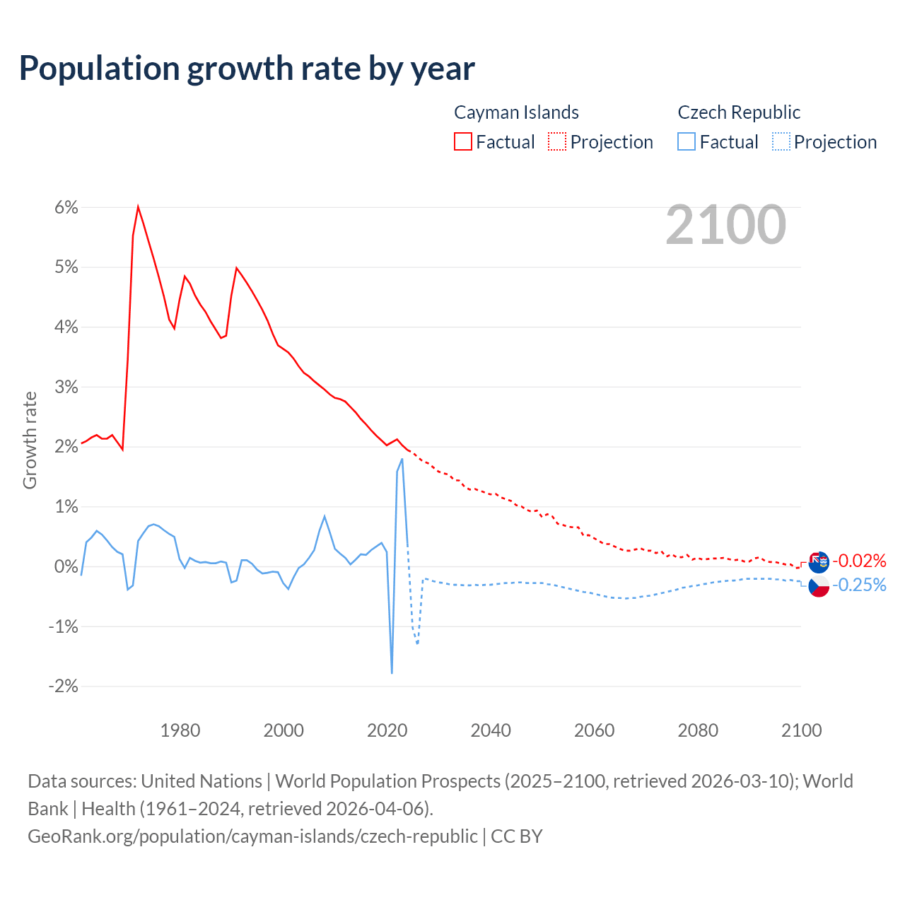 Data sources: World Bank | Health (1960–2024, retrieved 2026-04-06); United Nations | World Population Prospects (1960–2026, retrieved 2026-03-10); U.S. Census Bureau (1960–2025, retrieved 2026-02-08); Central Intelligence Agency (CIA) (2000–2019, retrieved 2026-02-20).