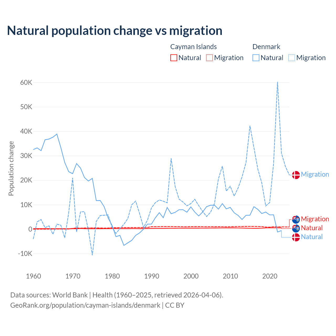 Over the last 10 years, 31.1% of the population change in the Cayman Islands is from natural causes (a gain of 4,468 people) and 68.9% is from migration (a gain of 9,879 people). In Denmark 15.4% is from natural causes (a gain of 51,826 people) and 84.6% is from migration (a gain of 284,848 people).