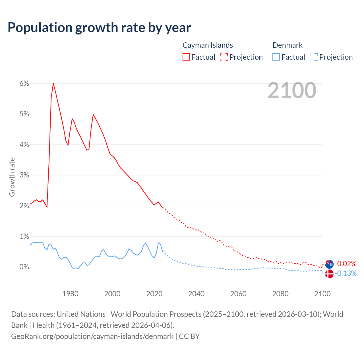 - For the last 10 years, the Cayman Islands has had an average growth rate of +2.19% per year vs +0.57% in Denmark.