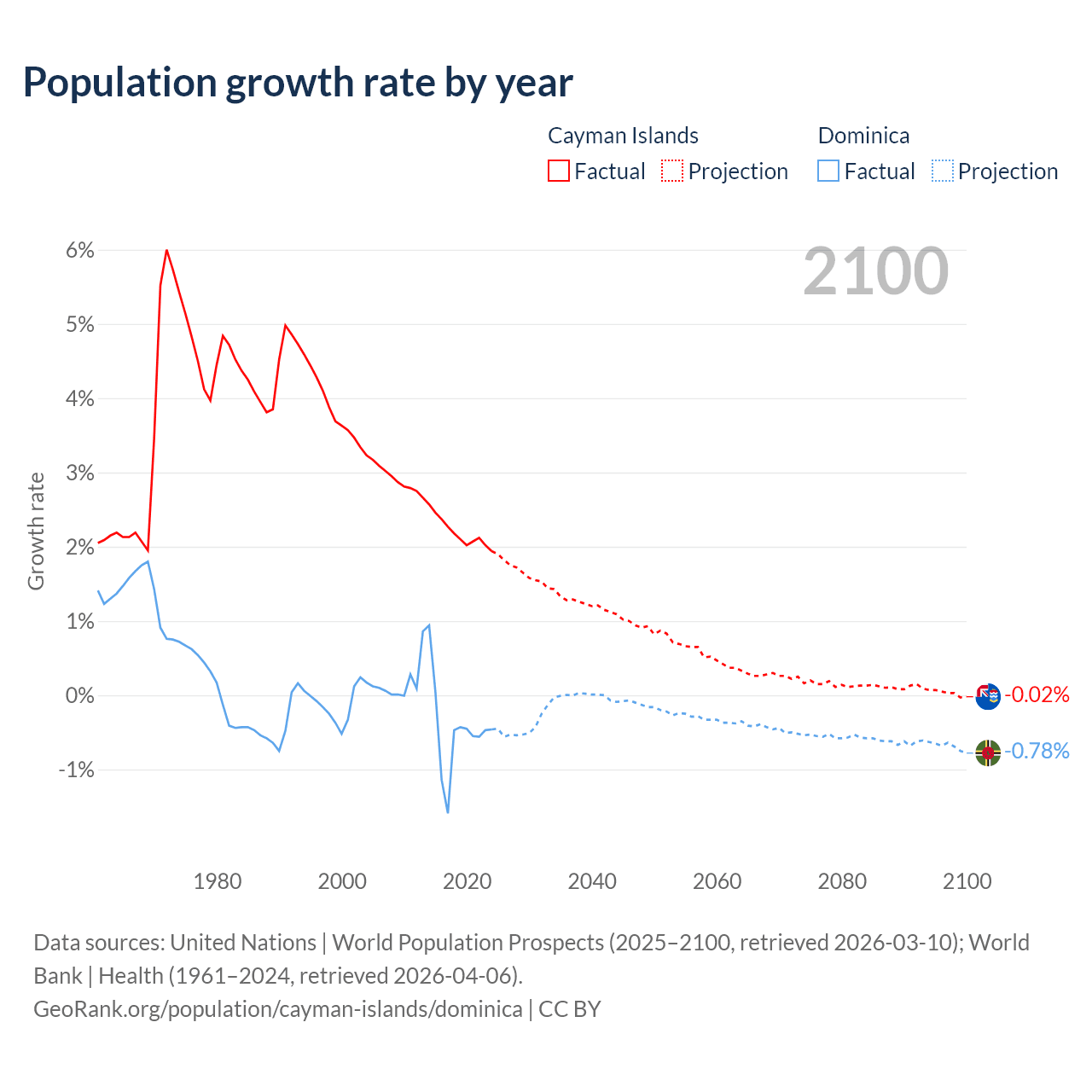 - For the last 10 years, the Cayman Islands has had an average growth rate of +2.19% per year vs -0.47% in Dominica.