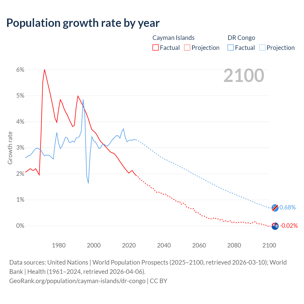 - For the last 10 years, the Cayman Islands has had an average growth rate of +2.19% per year vs +3.38% in the DR Congo.