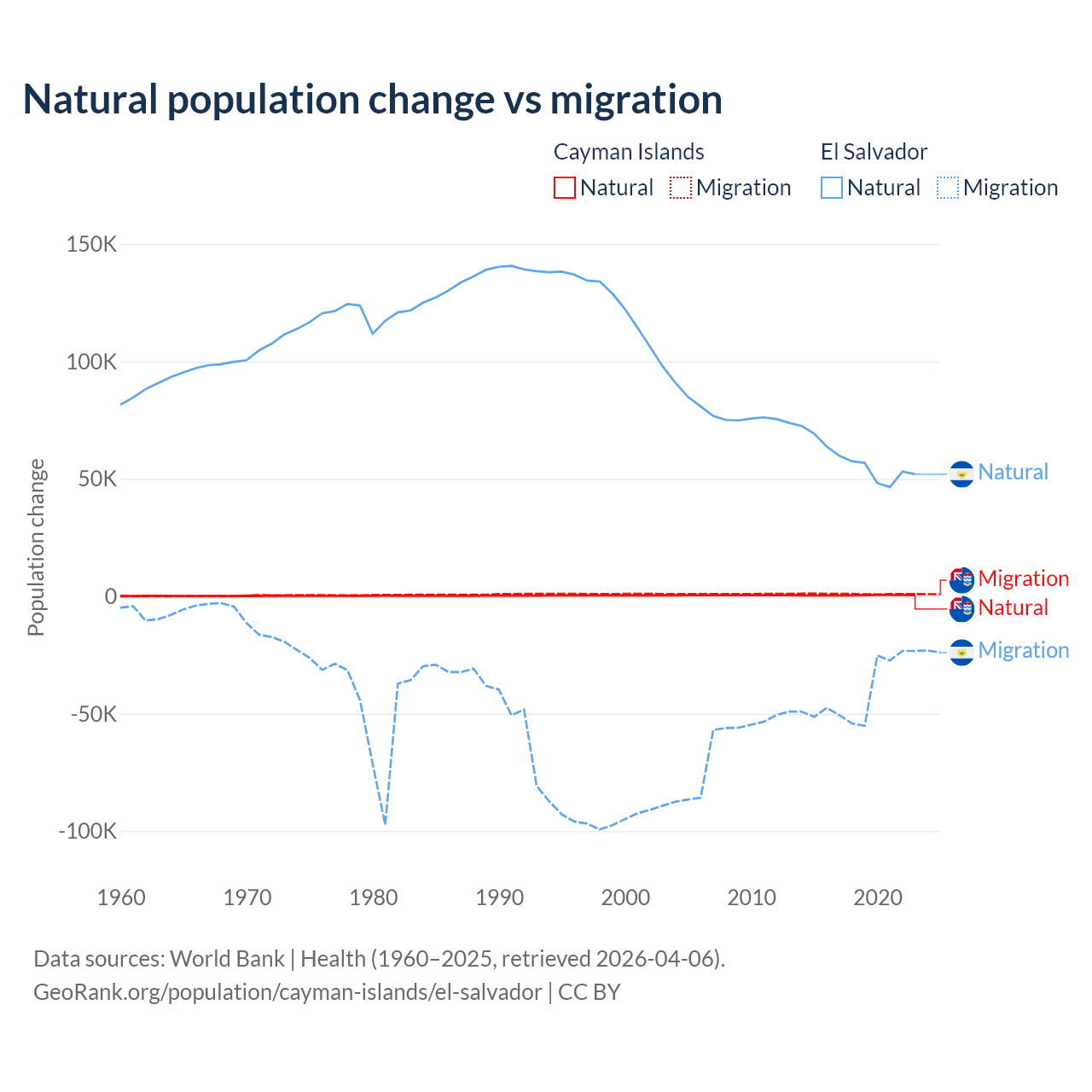 Over the last 10 years, 31.1% of the population change in the Cayman Islands is from natural causes (a gain of 4,468 people) and 68.9% is from migration (a gain of 9,879 people). In El Salvador 58.8% is from natural causes (a gain of 579,641 people) and 41.2% is from migration (a loss of 406,874 people).