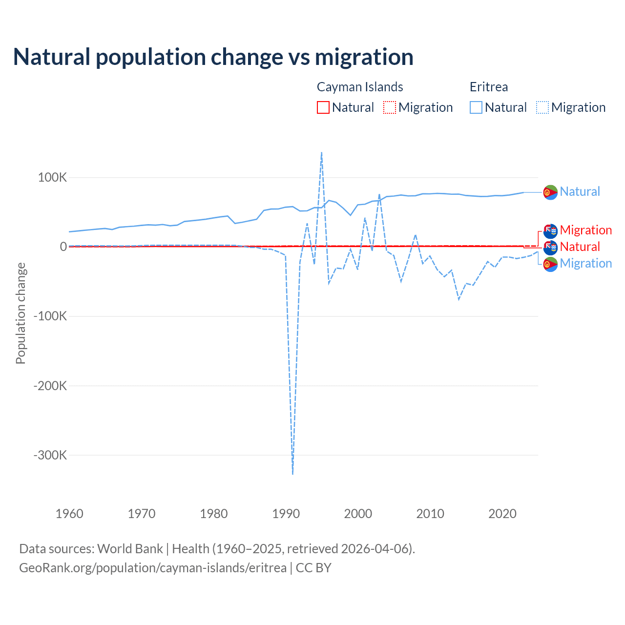 Over the last 10 years, 31.1% of the population change in the Cayman Islands is from natural causes (a gain of 4,468 people) and 68.9% is from migration (a gain of 9,879 people). In Eritrea 68.8% is from natural causes (a gain of 742,837 people) and 31.2% is from migration (a loss of 336,243 people).