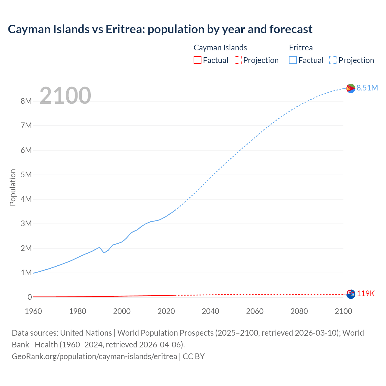 Cayman Islands vs Eritrea: population by year and forecast