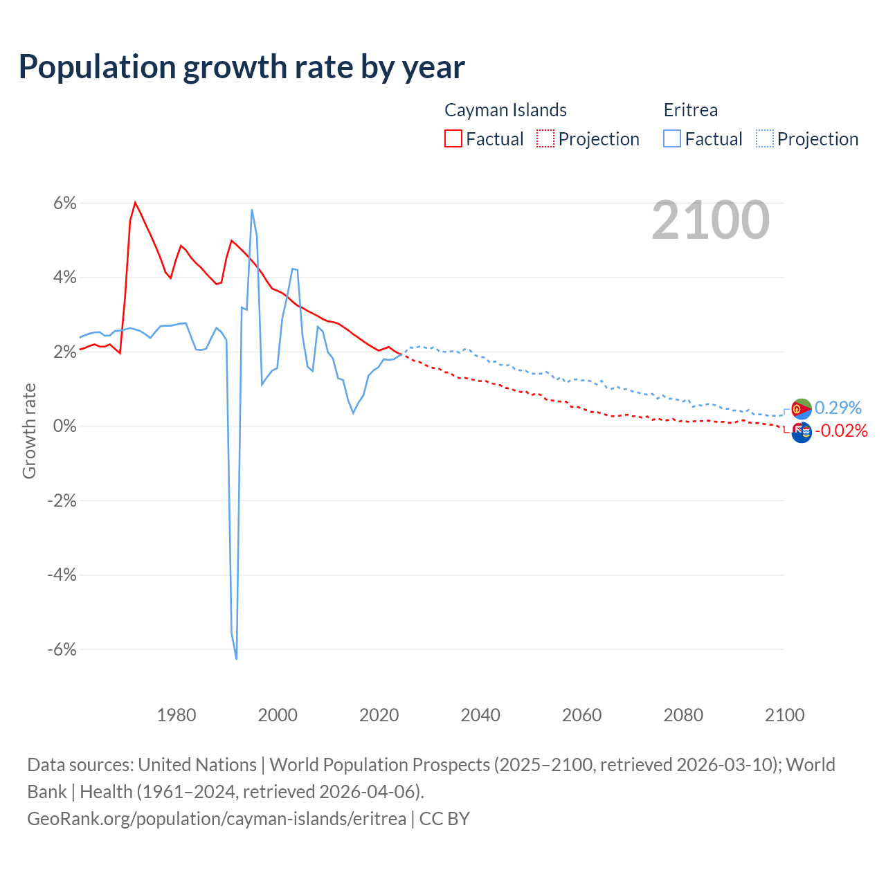 - For the last 10 years, the Cayman Islands has had an average growth rate of +2.19% per year vs +1.28% in Eritrea.