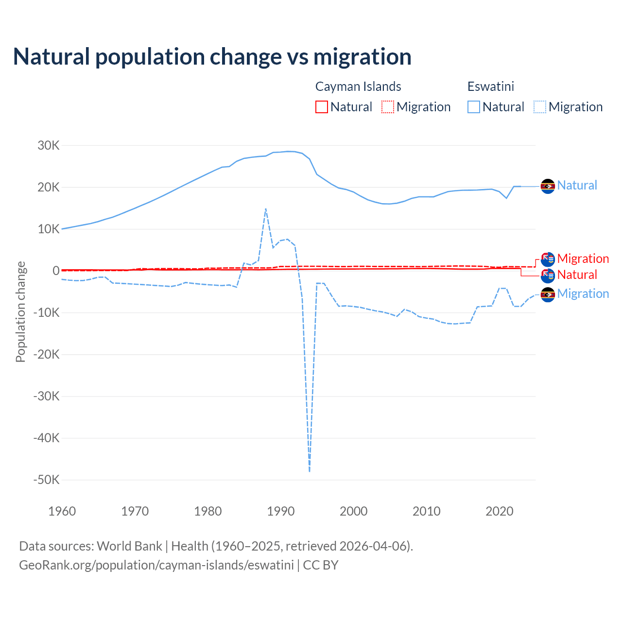 Over the last 10 years, 31.1% of the population change in the Cayman Islands is from natural causes (a gain of 4,468 people) and 68.9% is from migration (a gain of 9,879 people). In Eswatini 68.3% is from natural causes (a gain of 192,206 people) and 31.7% is from migration (a loss of 89,012 people).