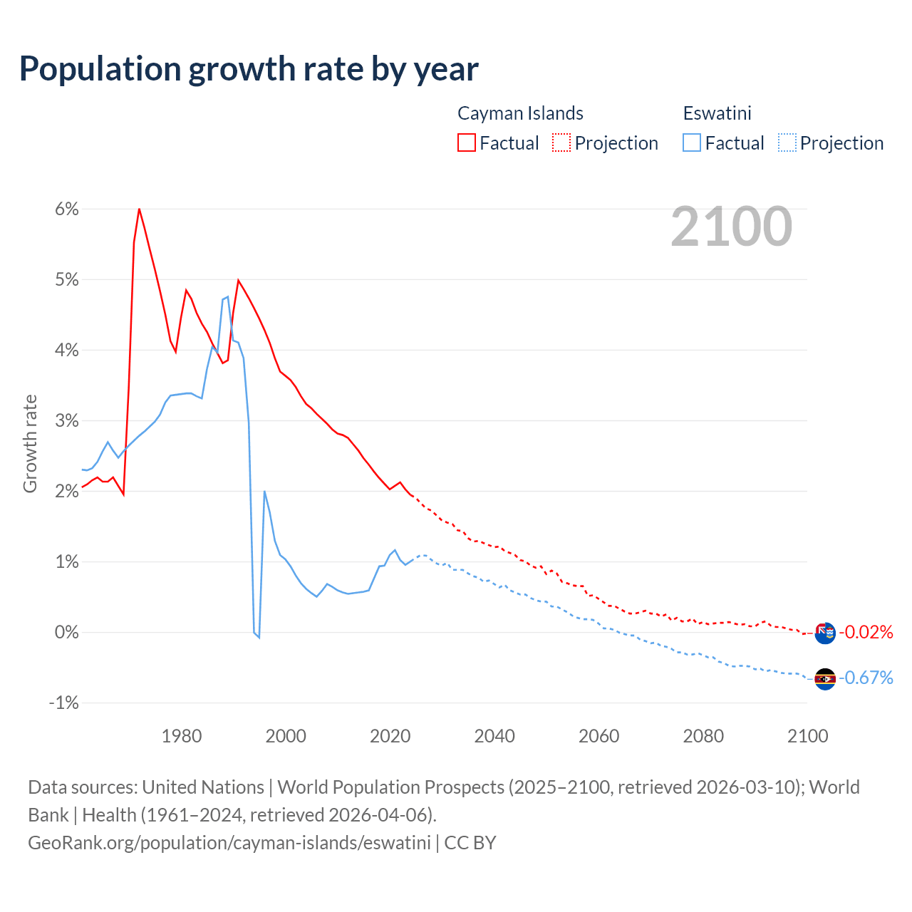 - For the last 10 years, the Cayman Islands has had an average growth rate of +2.19% per year vs +0.87% in Eswatini.